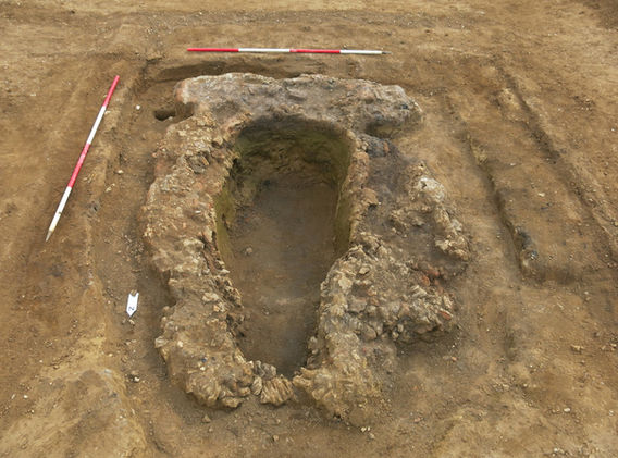 Malthouse 2 is located further to the north with no apparent overlap of malthouse 1. This malthouse consists of a kiln with an associated white clay floor which showed traces of burning. The kiln was well constructed, with firm daub base and walls, and even evidence for repairs. The kiln is significantly deeper than kiln 1 and a step was cut into the subsoil to allow better access to rake the kiln out. We have found no evidence for another steeping tank, and it may be that they re-used the steeping tank associated with malthouse 1, perhaps as suggested by a post-hole cut through malthouse 1's floor.